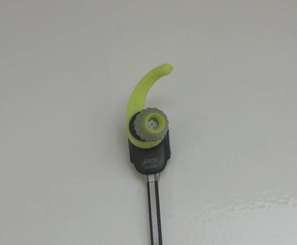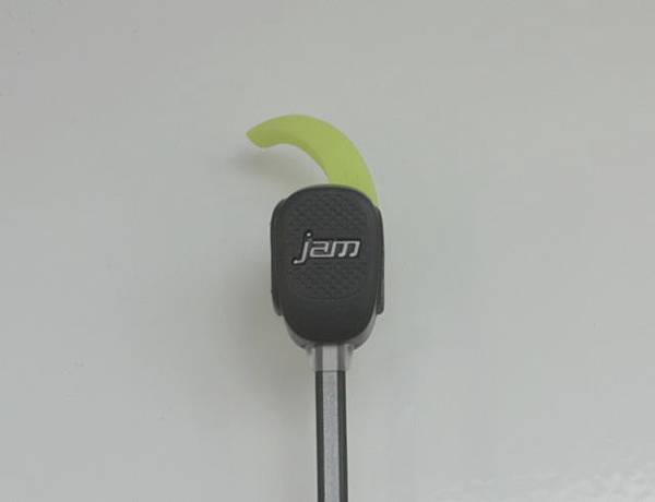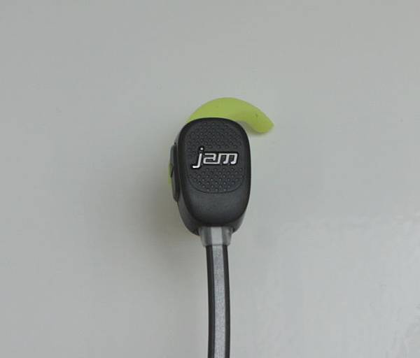 給您看一下耳機右耳部分,可以看到上面有jam的logo,同時耳機背面有做粗糙設計,就算有汗水的時候,也很好拿,不會滑掉