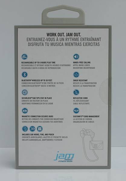 盒裝的背面,背面盒裝的設計風格跟 jam transit micro很像,同時也都把耳機的重點特色都寫出來了,如果仔細比對的話,其實兩款耳機真的差不多。這邊列舉一下耳機的特色: