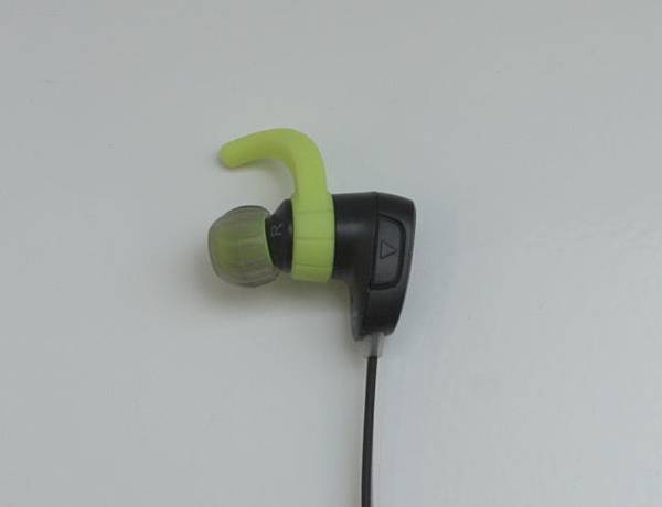 轉個角度再拍一張,可以看到耳內穩定器,滿牢固地固定在耳機上,它的設計角度還算OK,放入耳朵的時候固定的還不錯。同時可以看到螺紋耳塞,螺紋的設計讓耳機跟耳道多了一些摩擦力,使其較不易掉落。