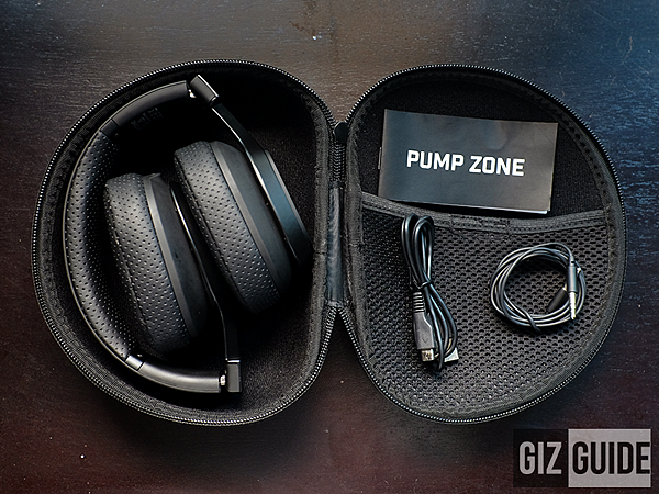 盒子本身很堅固,外觀是啞光材質,上面還印著一些資訊及產品特色。盒內有軟柔內襯來保護 外殼堅硬、可用拉鍊拉開 的外出旅行盒。打開後可以看到裡面有PUMP Zone耳罩式無線藍牙耳機一副、說明書、線材等。旅行盒的容量可說是非常大。