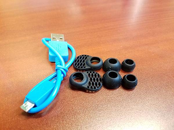 打開包裝盒會發現,除了有 Gravity 的本體頸帶之外,還有附1條micro USB充電線、3組尺寸的矽膠耳塞、2組蜂窩結構狀的耳內穩定器和JBuds Pro有線耳機。如果你沒有任何有線耳機可以拿來和Gravity頸帶一同使用的話,它內附的有線耳機是一個還不錯的選擇。
